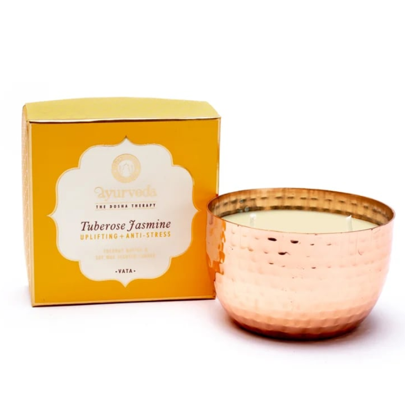 Vela natural ayurvédica Vata Tuberosa y Jazmin, notas aromaticas de las frescas flores de jazmín de la India se combinan fabulosamente con las flores blancas de tuberosa para formar una fragancia estimulante capaz de aliviar el estrés. De gran beneficio para las personas de dosha Vata Dosha.